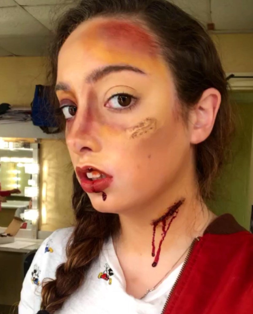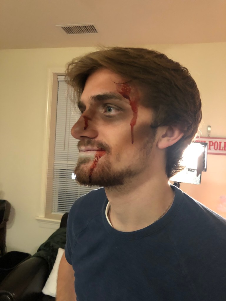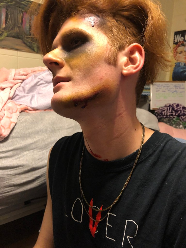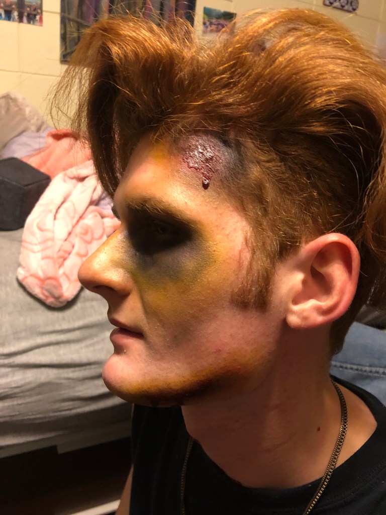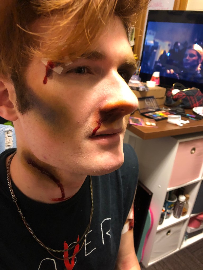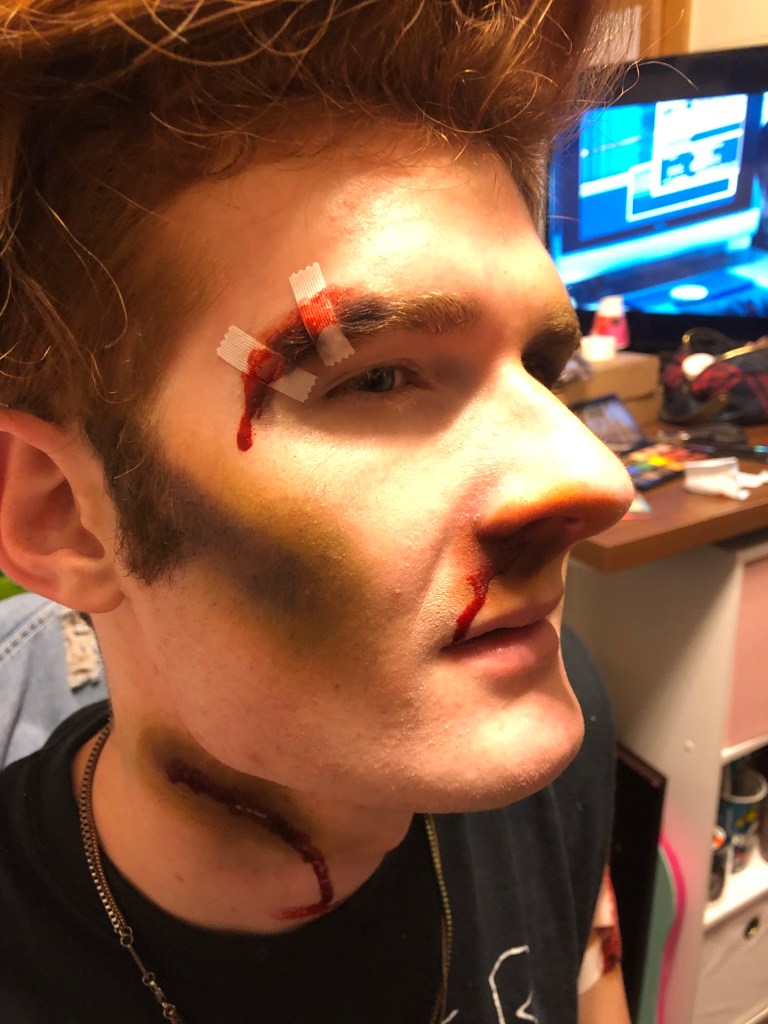 Every Halloween, my friends come to me for spooky scary injuries. I use Ben Nye fake blood and cheap eyeshadow to create these looks.