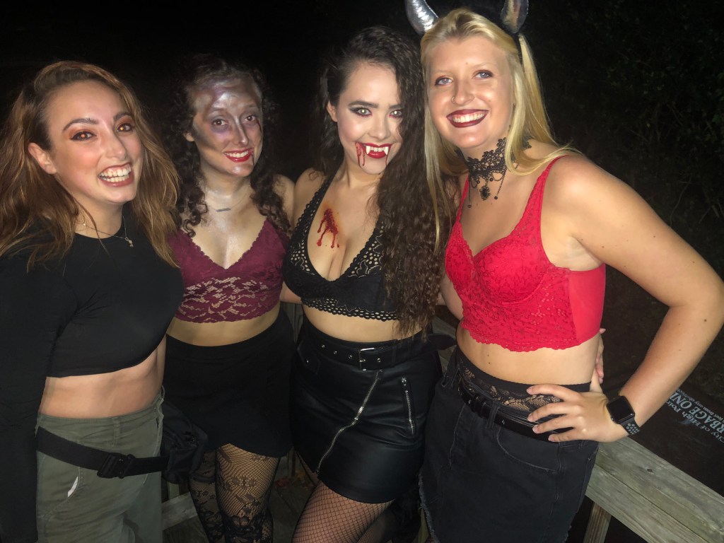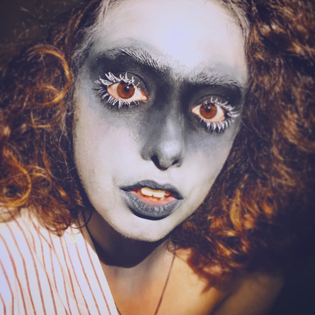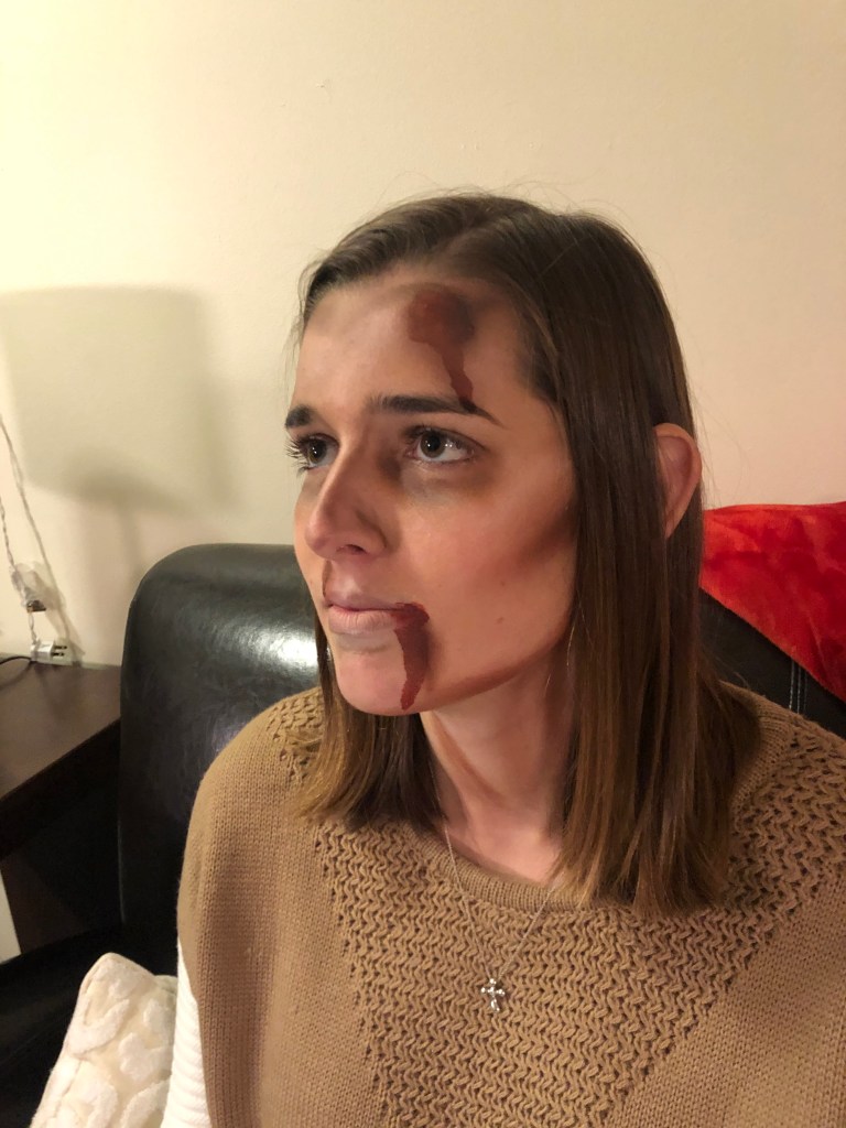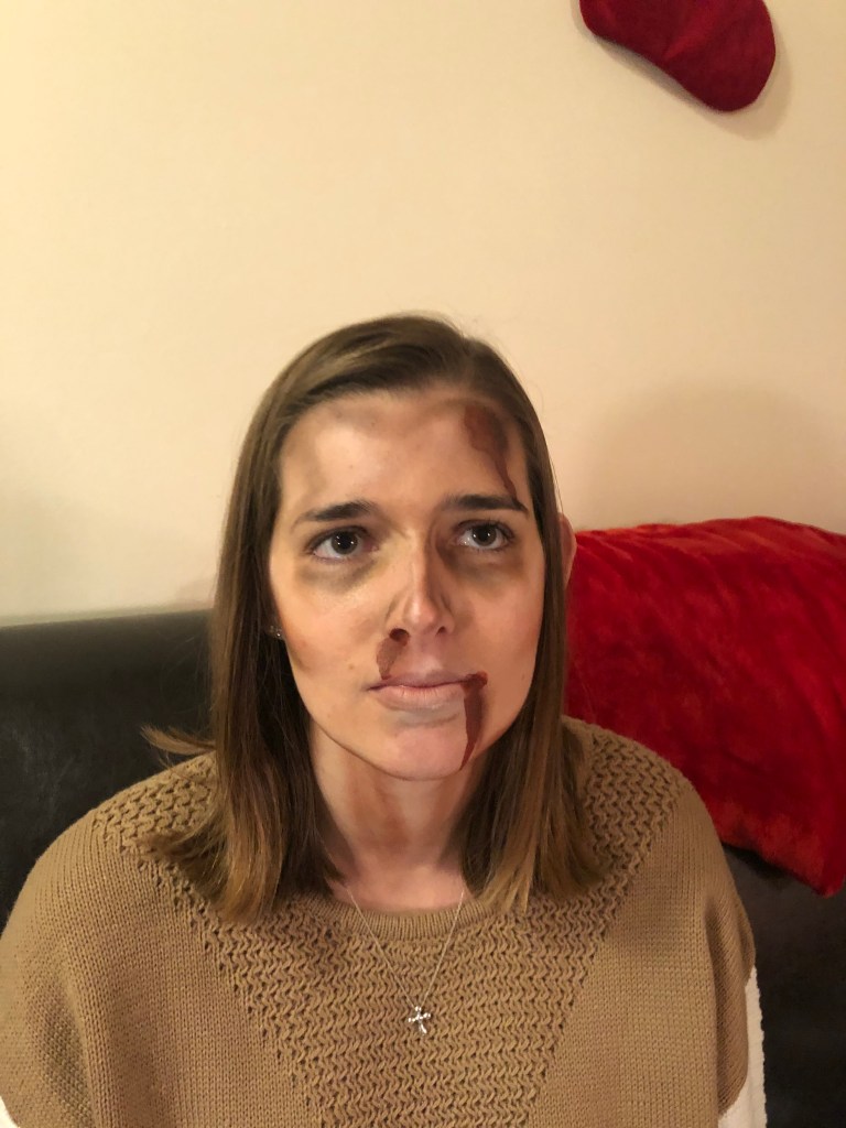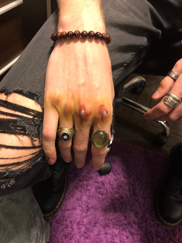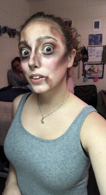 Every Halloween, my friends come to me for spooky scary injuries. I use Ben Nye fake blood and cheap eyeshadow to create these looks.