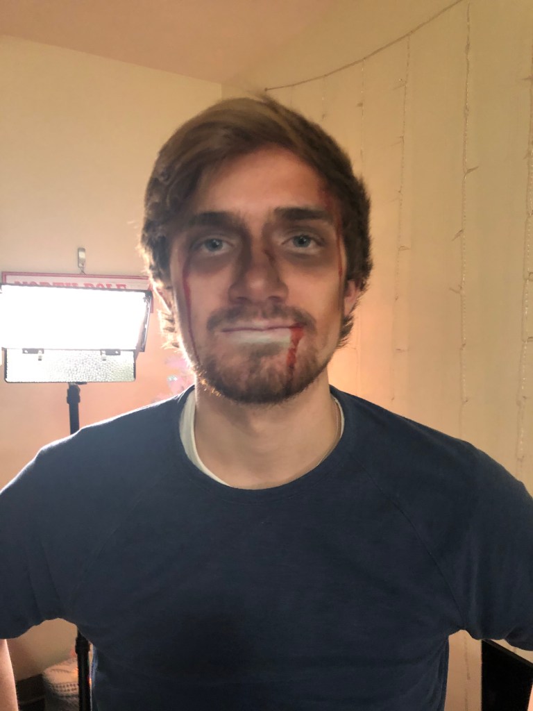 supplied with paint brushes and a Halloween store zombie makeup kit, I applied gore makeup to my fellow actors in less than 15 minutes